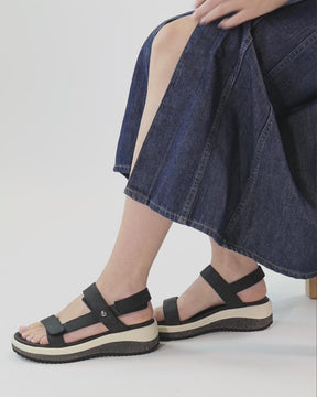 Wedge sandals. Black nappa grass leather. Velcro Closure. Leather lining. Anatomical insole. Flexible and durable Polyurethane sole. Heel height: 7.25 cm. 100% Made in Spain.