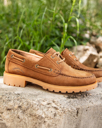 Lady Boat Shoe. WATERPROOF Tan Nobuck Leather. Lace-up Closure. Leather lining. Removable anatomical insole. Natural, flexible and durable rubber sole. Heel height: 4 cm. 100% Made in Spain.