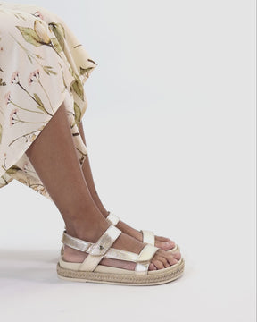 Flat woman's sandals. Gold nappa leather. Velcro Closure. Leather lining. Anatomical insole. Flexible and durable Polyurethane sole. Heel height: 4.5 cm. 100% Made in Spain.
