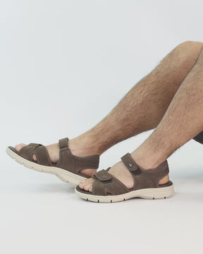 Men's sandals. WATERPROOF Grey Nobuck Leather. Velcro Closure. Lycra lining. Anatomical insole. Flexible and durable Polyurethane sole. Heel height: 5 cm. 100% Made in Spain.