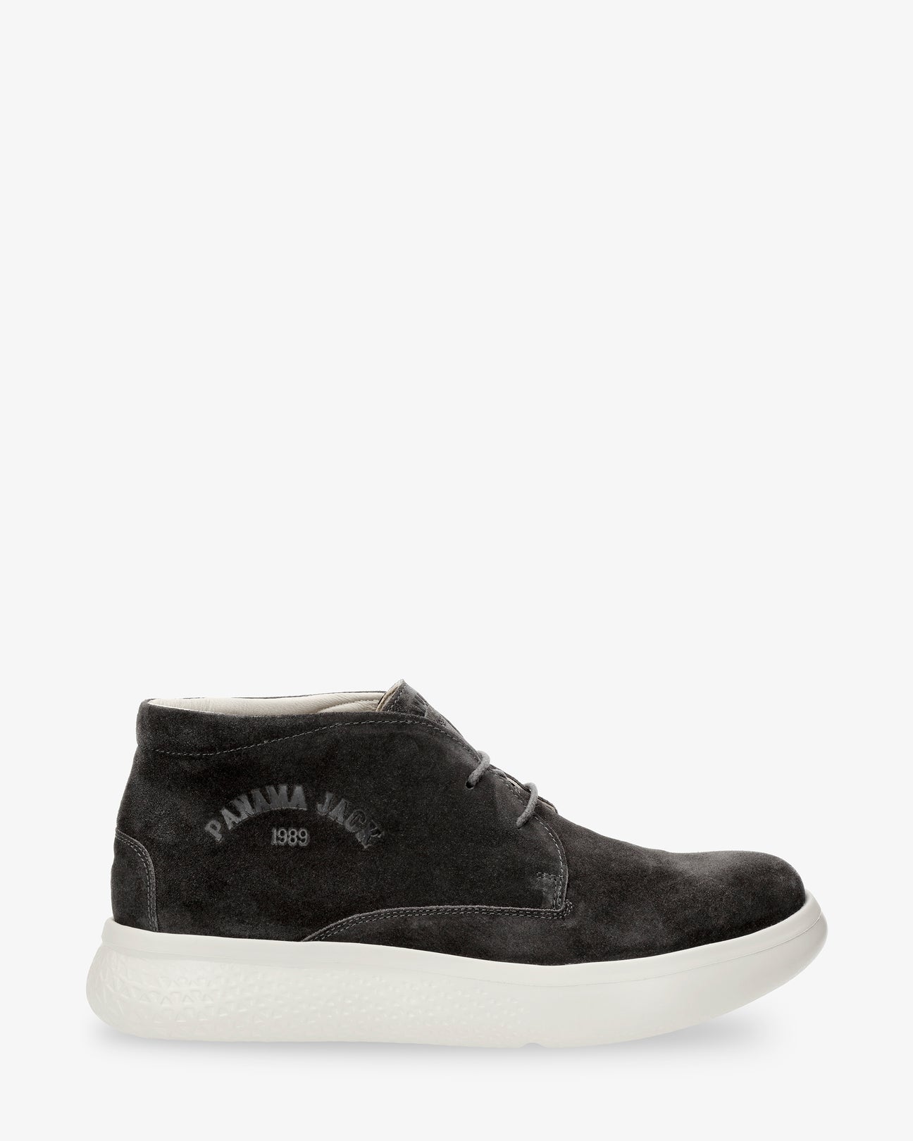 Flat men's ANKLE Boot. Grey Velour Leather. Lace-up Closure. Leather lining. Removable anatomical insole. Lightweight, flexible and strong EVA rubber sole. Shaft height: 9 cm. Heel height: 4.3 cm. 100% Made in Spain.