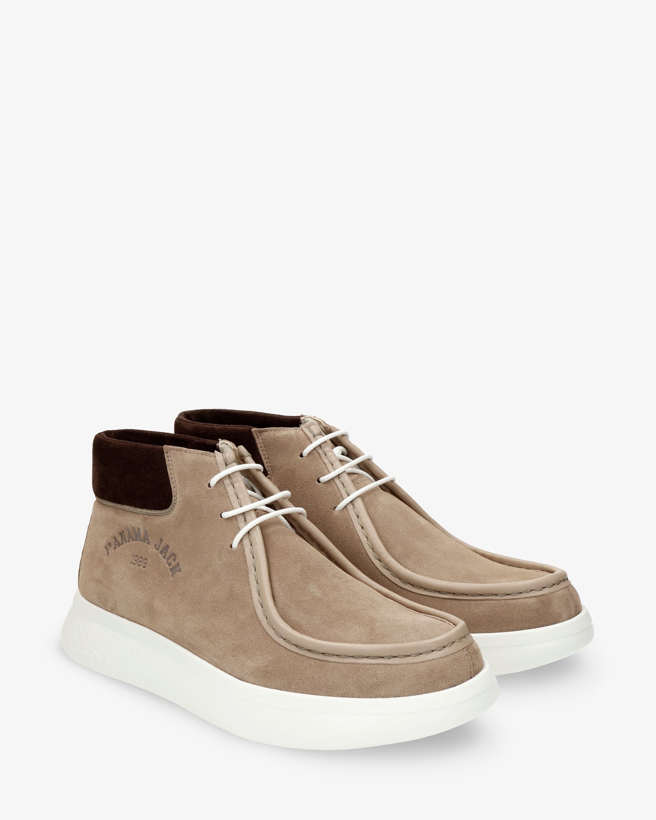 Flat men's ANKLE Boot. WATERPROOF Taupe Velour Leather. Lace-up Closure. Leather lining. Removable anatomical insole. Lightweight, flexible and strong EVA rubber sole. Shaft height: 10 cm. Heel height: 4.3 cm. 100% Made in Spain.